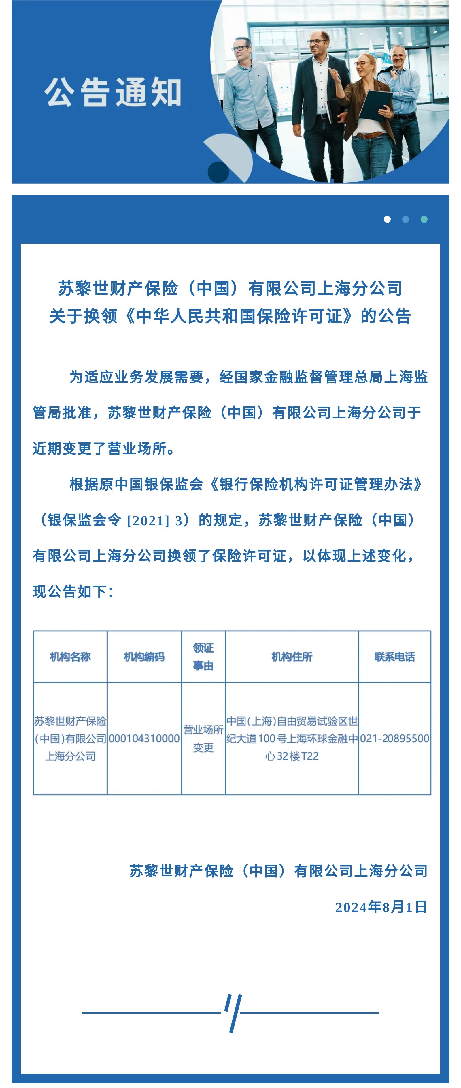 苏黎世财产保险(中国)有限公司上海分公司关于更换《中华人民共和国保险许可证》的公告