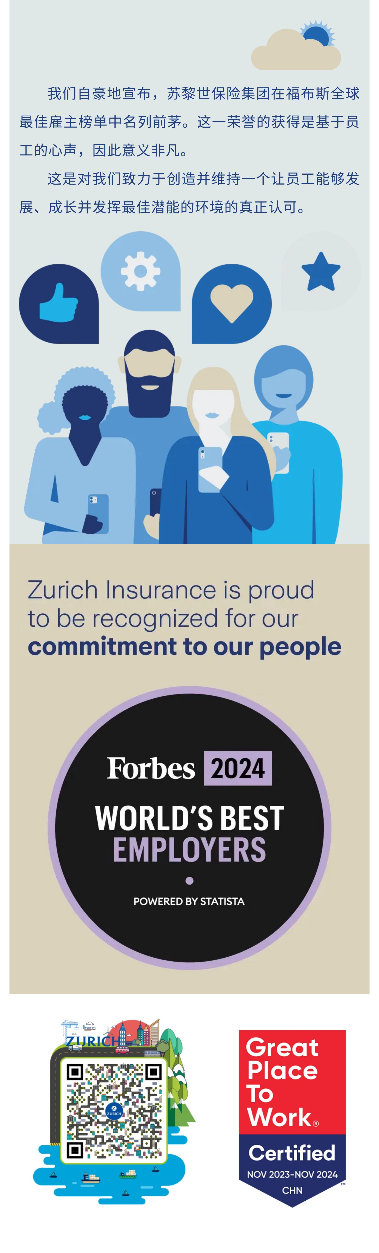 苏黎世保险是福布斯“2024 年全球最佳雇主 ”之公认的顶级保险公司之一
