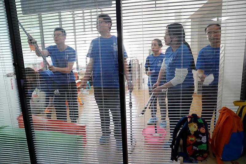 本次活动的主要内容是擦洗玻璃。工作并不复杂,但对于整日里坐办公室的白领们来说,还是带有一定的挑战性。一开始不是水多了, 就是刮水器角度不对,费力还没擦干净,组装擦玻璃器也耗费了很多的时间。但很快,大家就都上手了,两层楼的教室玻璃很快都被擦拭的干净透亮。